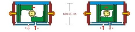 气缸中腔的空气通过A孔排出,同时中心轴便顺时针方向旋转90°,所对应的阀门
