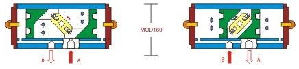 当压缩空气从A孔进入两活塞之间的中腔时,由于压力作用使两活塞分离。